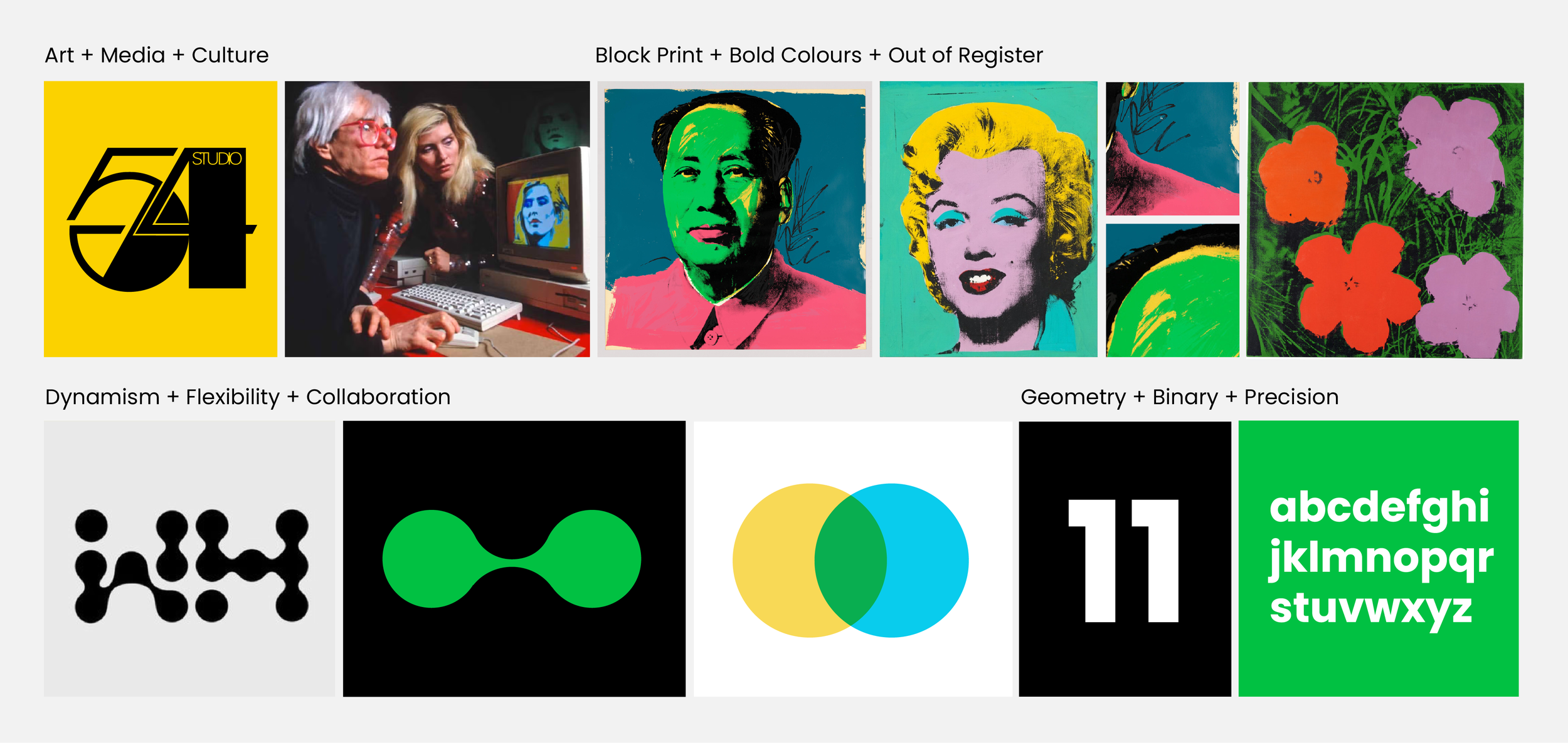 Initial Moodboard: a conversation between the clients inspiration and the visual concept I created. Andy Warhol’s The Factory and Studio54 as recognised creative hubs meets fluidity, collaboration and precision.