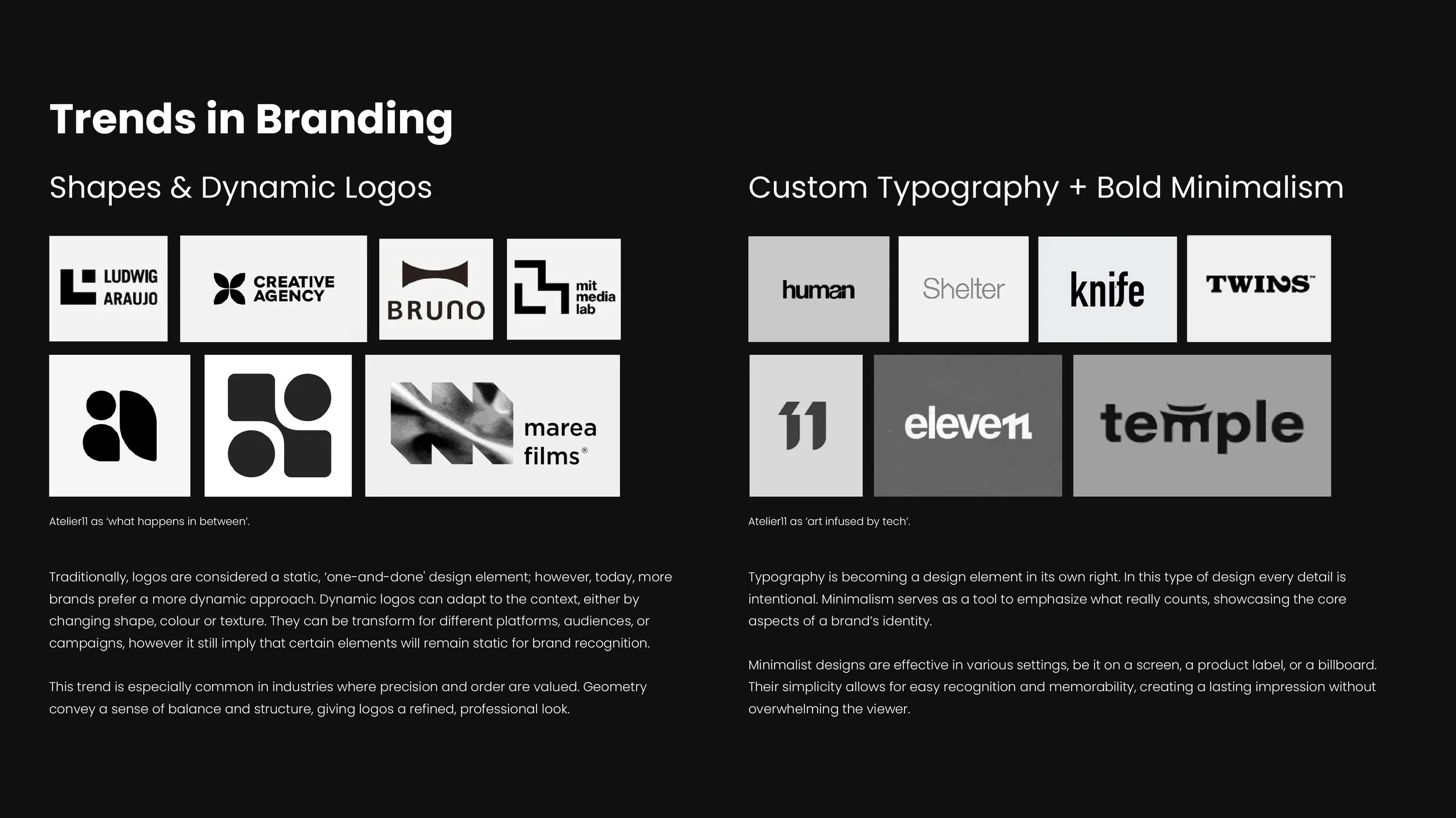 The research showed that a combination of icon and word mark, sans serif typefaces and a digital-first and flexible identity that takes into consideration the use on dark backgrounds it was the right choice for Atelier11.